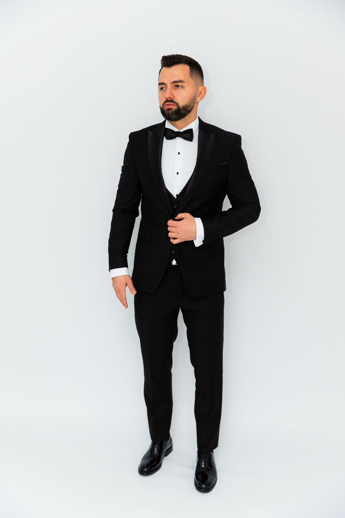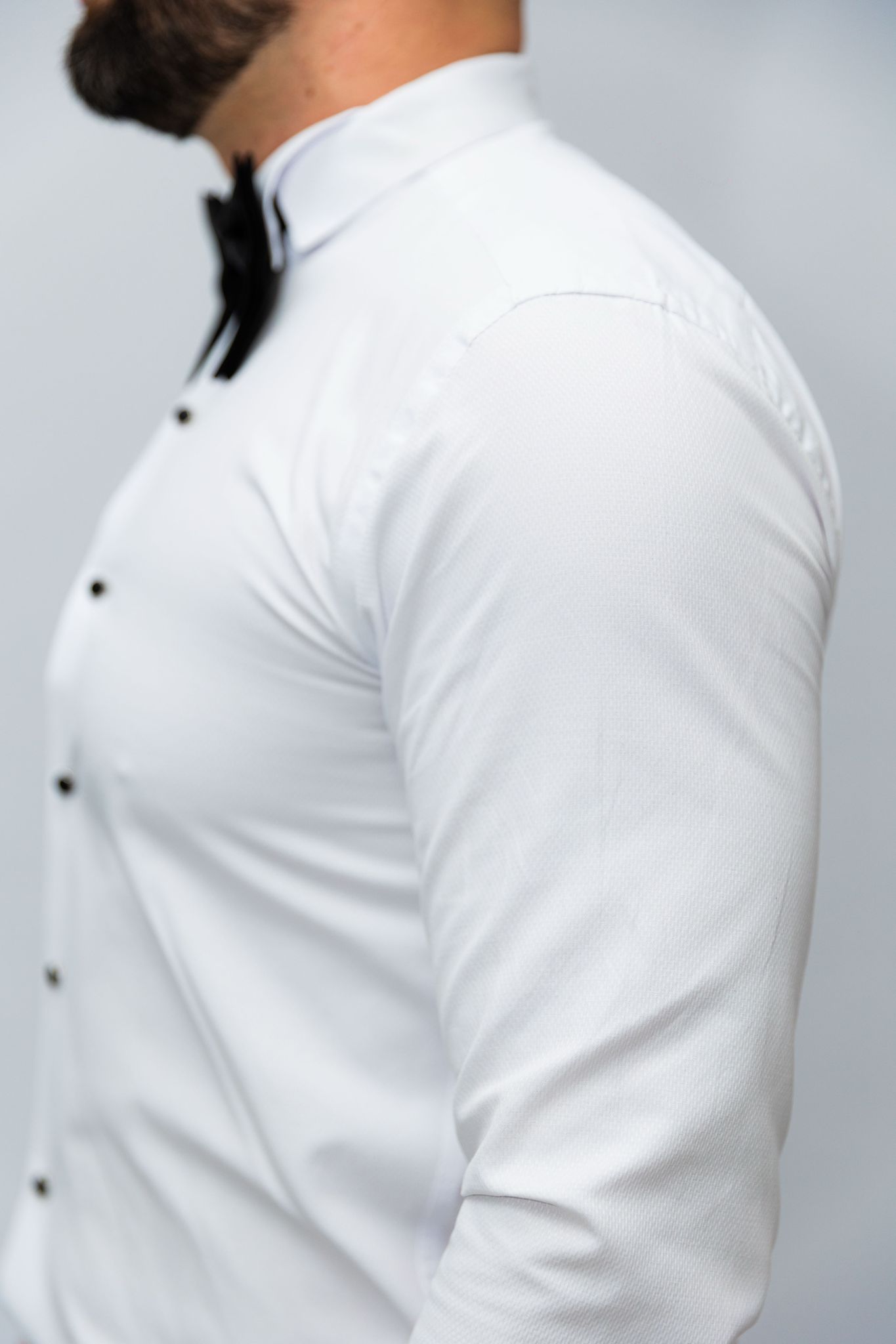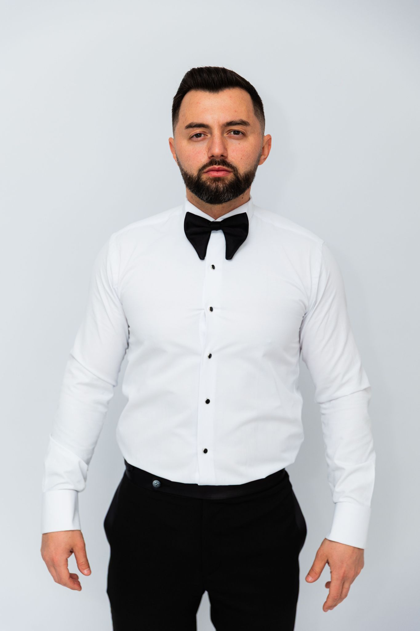 Camasa de ceremonie si gala Barbati Albă cu nasturi Semi luciosi negri onix si guler randunica de papion, perfecta pentru o varietate de ocazii sau evenimente formale de seara.Camasa are un design formal dat de gulerul randunica, care adauga o nota eleganta si sofisticata la tinuta. Culoarea alba a camasii este potrivita pentru a fi asortata cu o varietate de culori, astfel incat poate fi inclusa cu usurinta intr-o varietate de costume de tip smoking sau formale de seara.
