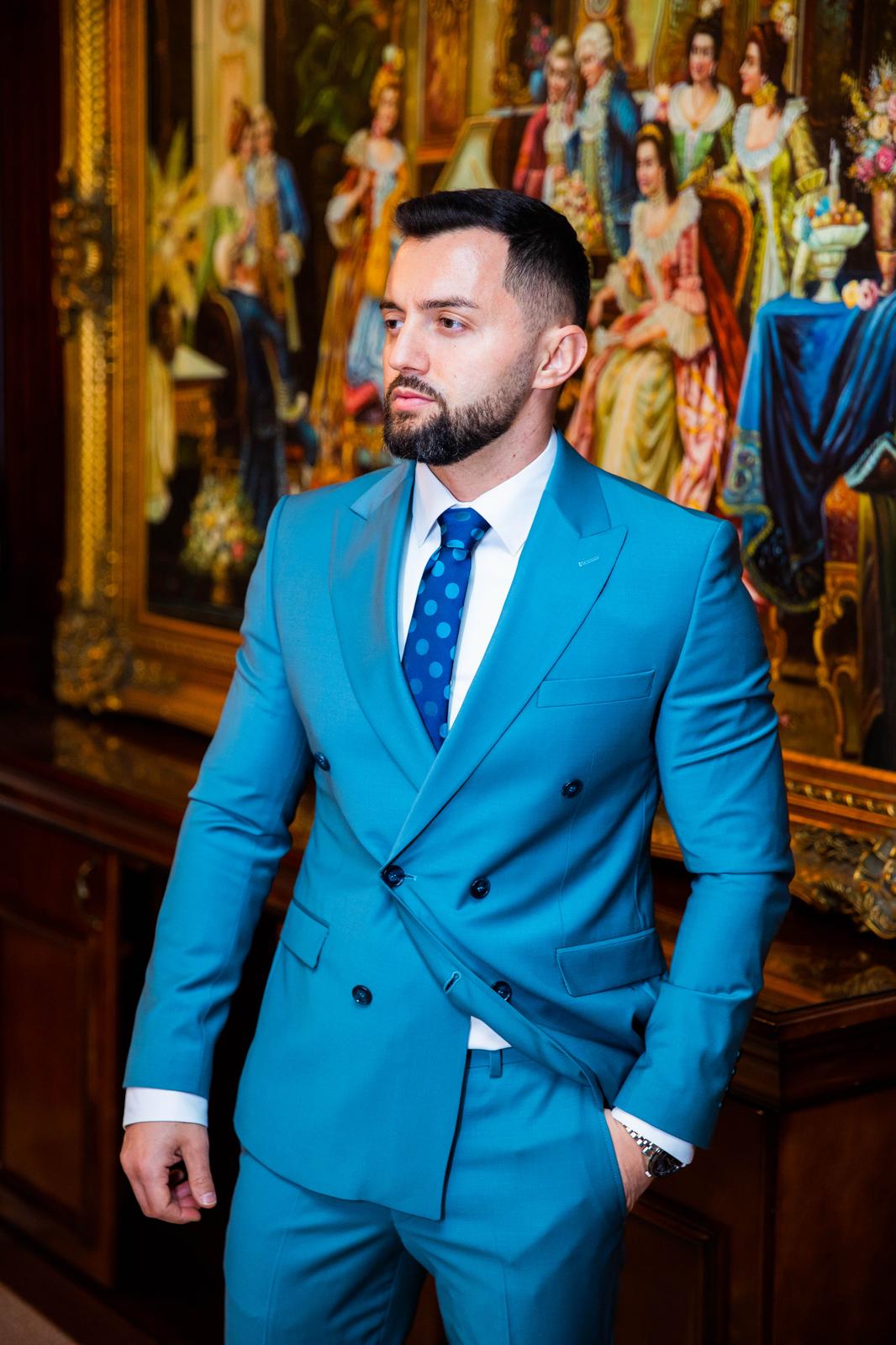 Costum Bărbați Turcoaz Elegant Două Rânduri, din 88% lână Super 160’s, croială slim fit și finisaje premium, ideal pentru evenimente elegante și formale.